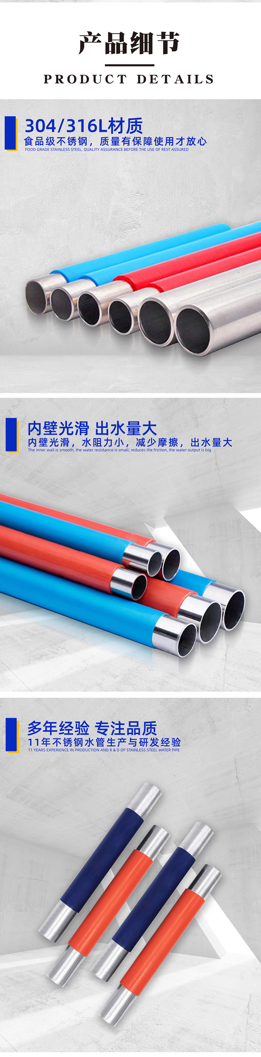 覆塑不銹鋼水管:一種外壁有塑料包塑層的薄壁不銹鋼水管。外層塑料套起到保護不銹鋼外壁的作用,因為在墻體內(nèi)會對不銹鋼外壁造成腐蝕,所以一般埋設(shè)在墻體內(nèi)得不銹鋼管都要做外層保護。