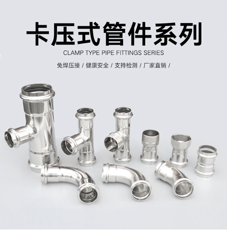 雙卡壓式薄壁不銹鋼管連接是將管材插入管件,利用不銹鋼材料的有效剛性和密封材料的彈性壓縮比原理,同時(shí)充分利用承接口的長度在管件承接口的U型槽兩側(cè)用專用卡壓工具進(jìn)行徑向壓接。