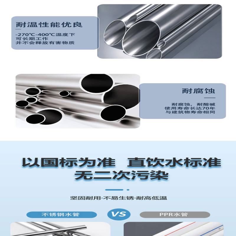 不銹鋼水管無塑化劑滲出,不易腐蝕,不生銹,不滋生細(xì)菌,使用壽命長,安全健康,綠色環(huán)保。從健康角度來看,使用不銹鋼水管完全能夠防止水的二次污染。來自外部的城市供水管網(wǎng)的自來水是通過采用不銹鋼水管管道設(shè)計和連接方式的優(yōu)化,從內(nèi)部護(hù)送新鮮和健康的供水。